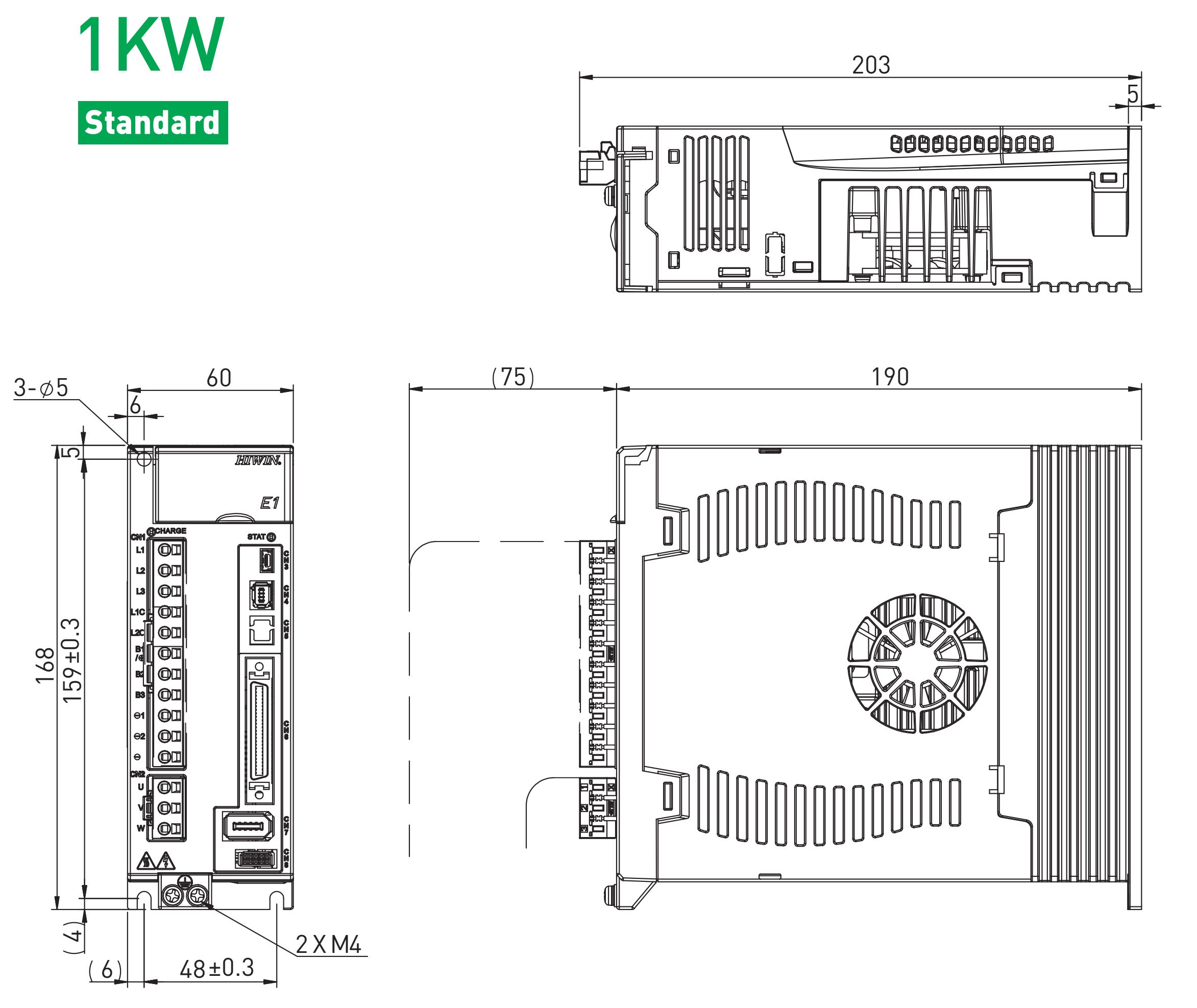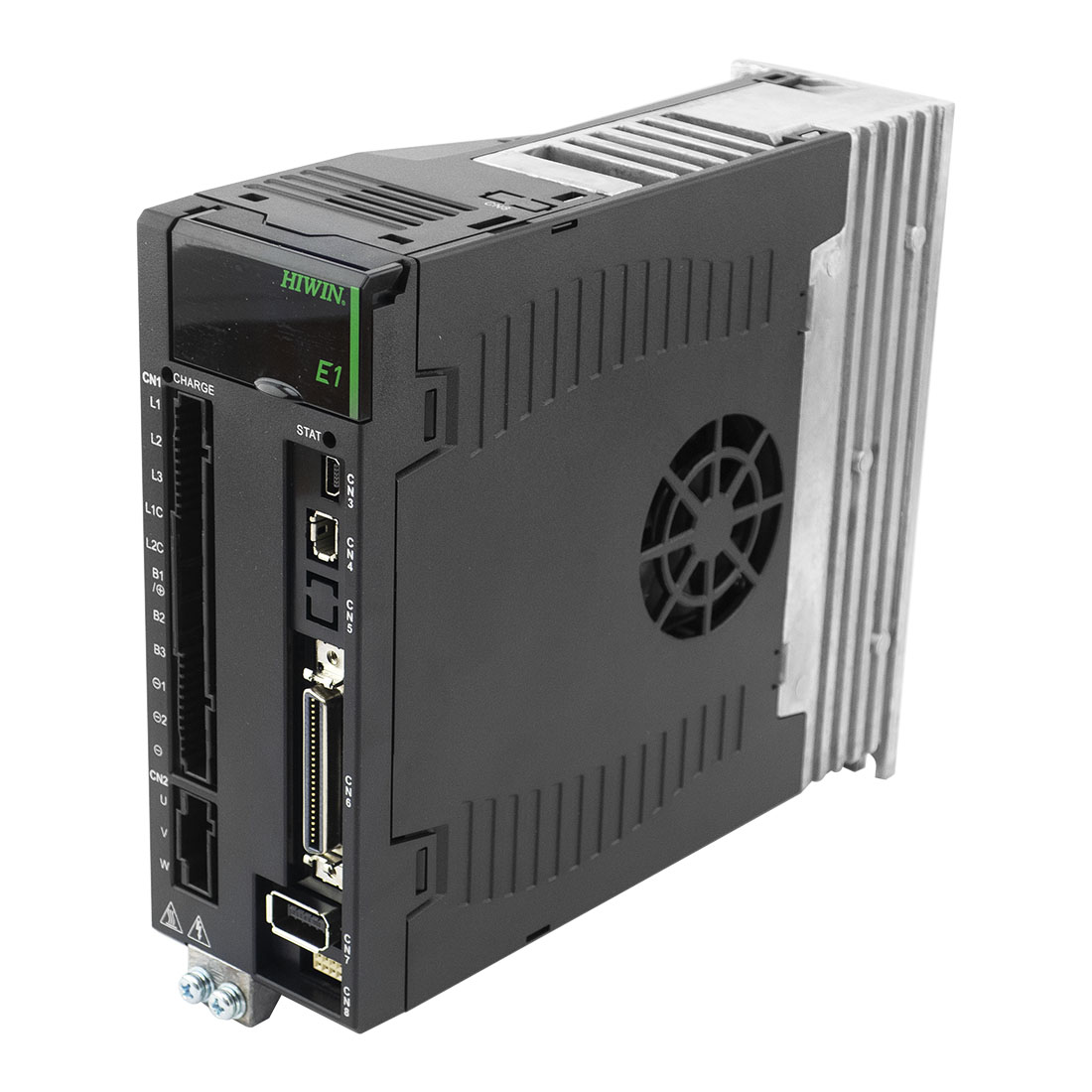 Серводрайвер серии E1 предназначен для работы с серводвигателем мощностью до 1 кВт и энкодером с разрешением 23 бит. Может работать с внешним контроллером в режимах задания позиции, скорости, момента или автономно в соответствии с программой, написанной пользователем. Режим управления преобразователем - векторная ШИМ. Запитывается драйвер от 1 или 3 фаз 220В. Для настройки привода на передней панели имеется 7 сегментный дисплей с 4-мя кнопками управления и USB разьем для настройки с ПК. Для управления используется стандартный инитерфейс (импульсный). Драйвер работает с оптоизолированными (до 200 КГц) или дифференциальными импульсными входами(до 5 МГц.) и имеет выход эмулятора энкодера с настраиваемой электронной редукцией. Драйвер поддерживает квадратупные энкодеры, а с помощью ESC можно подключать также аналоговые (SIN/COS) и цифровые (BiSS-C, EnDat 2.1/2.2, Tamagawa) энкодеры, PTC термодатчики и датчики Холла. У драйвера имеется 10 входов, 5 выходов общего назначения и один вход АЦП 16бит. Драйвер поддерживает: