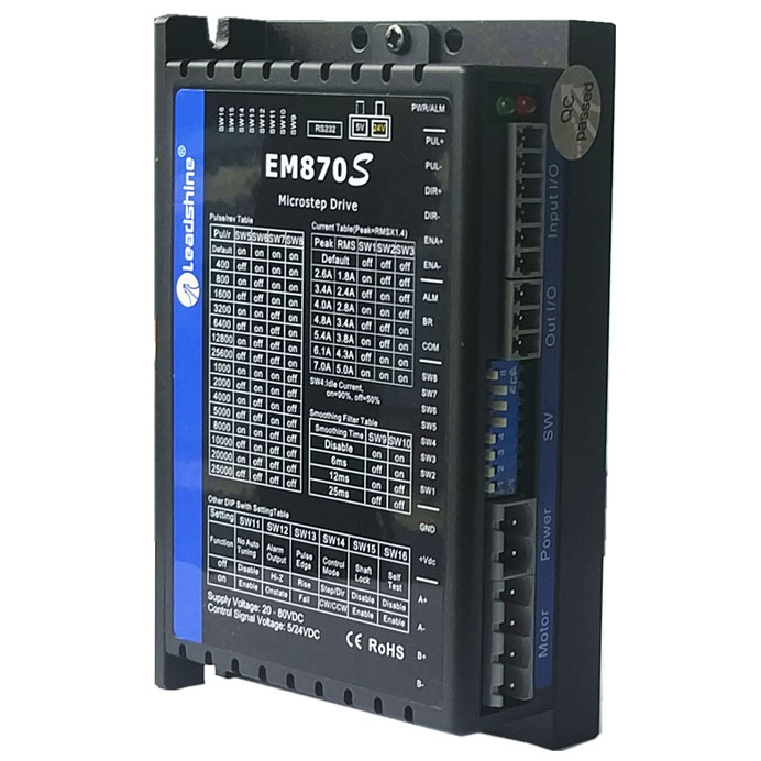 Leadshine EM870S - новый цифровой шаговый драйвер разработанный на основе серии DM. Драйвер по прежнему прост в настройке, имеет аналогичное исполнение, позволяет достичь высокой точности и надежности в работе. Весь функционал предыдущей серии также сохранен.