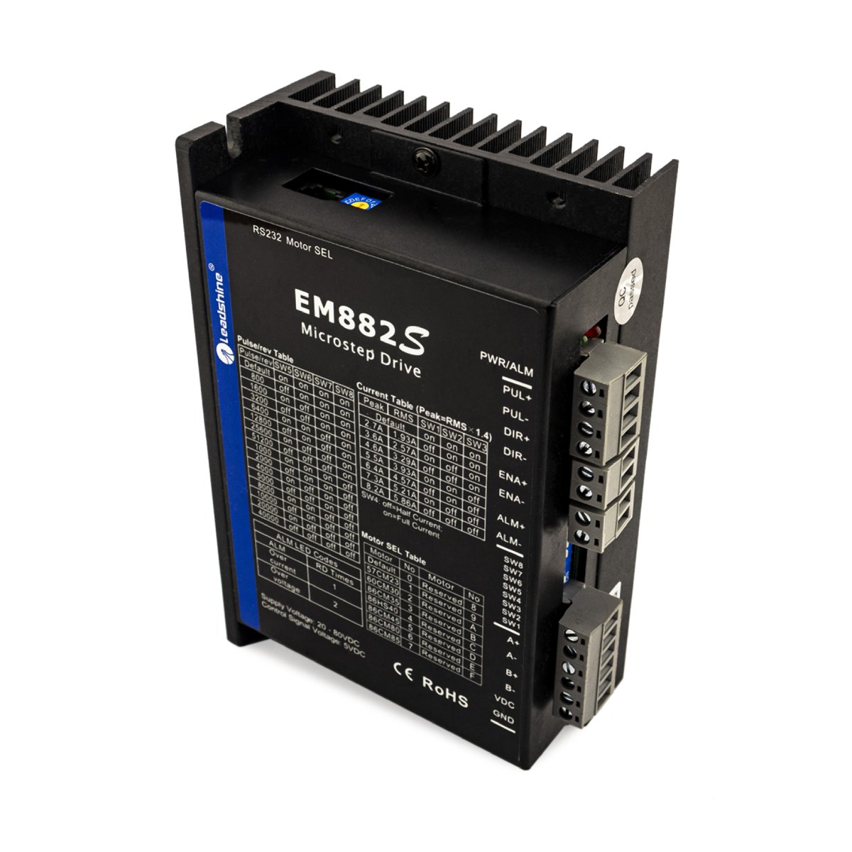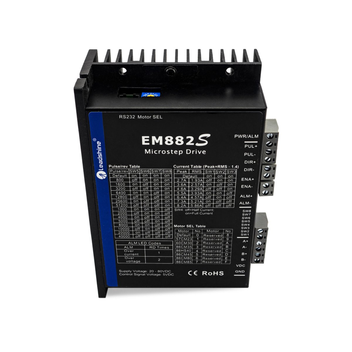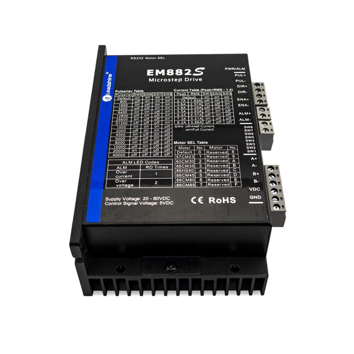 Leadshine EM882S - новый цифровой шаговый драйвер разработанный на основе серии DM. Драйвер по прежнему прост в настройке, имеет аналогичное исполнение, позволяет достичь высокой точности и надежности в работе. Весь функционал предыдущей серии также сохранен.
