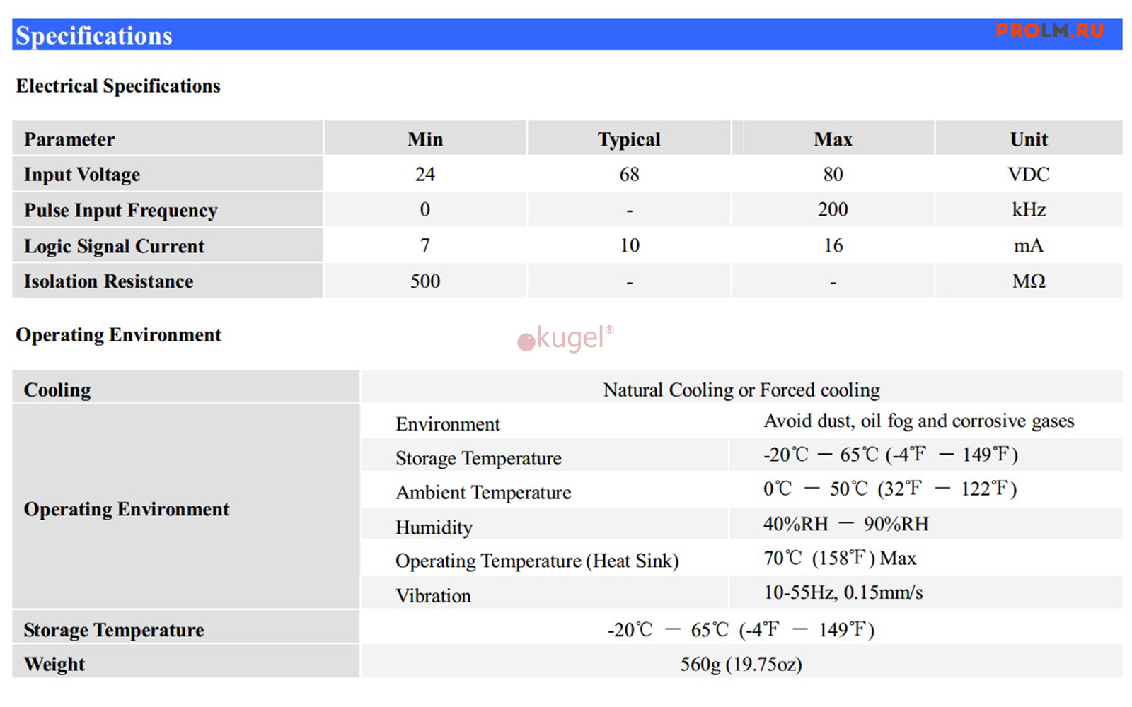 | Выходной ток, А (пиковый) | Напряжение питания, В DC | Микрошаг, максимальное дробление | Приемистость по входу, кГц | |||
