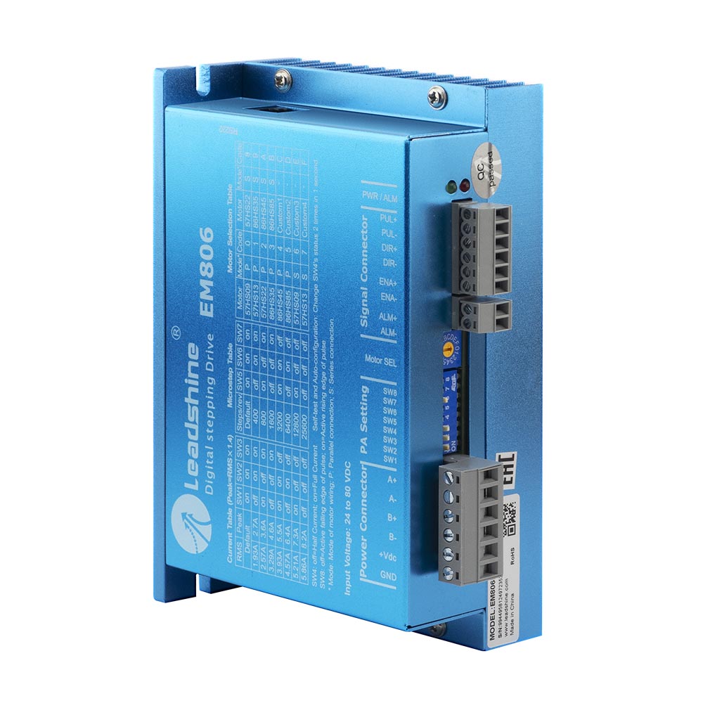 EM806 представляет собой усовершенствованный высокоэффективный двухфазный цифровой шаговый привод на основе DSP. Одной из особенностей серии EM является возможность детектирования остановки вала двигателя без использования энкодера при частоте вращения выше 300об/мин. Функция синтеза микрошага позволяет использовать контроллеры с меньшей выходной частотой обеспечивая при этом плавное, тихое движение двигателя и меньший нагрев. В немалой степени плавному ходу способствуют и антирезонансные алгоритмы работы. Драйвер EM806 легко настроить с помощью DIP-переключателей. Имеется 15 уставок микрошага от 1/1 до 1/125, и 7 уставок выходного тока от 2,7 до 8,2 А. Функция автоподстройки позволяет быстро и легко настроить различные двигатели на максимальную производительность. Leadshine также предлагает согласованные шаговые двигатели собственного производства конфигурации которых предварительно сохранены в драйвере. Пользователю требуется лишь использовать поворотный переключатель, чтобы выбрать правильный двигатель, и EM806 автоматически загрузит предварительно настроенные оптимизированные настройки для достижения наилучшей производительности. Для опытных пользователей Leadshine предлагает программное обеспечение по тонкой настройке и оптимизации праметров. Пользователь может настроить три резонансные зоны, чтобы уменьшить шум и вибрацию, установить произвольное разрешение микрошага, настроить выходной ток с шагом 0,1 А в диапазоне 0,5 - 8,2 А, и ток холостого хода на 1-100% от выходного тока. Поддерживает режимы PUL / DIR. Рекомендуем использовать этот драйвер с двигателями типа NEMA 23,34.