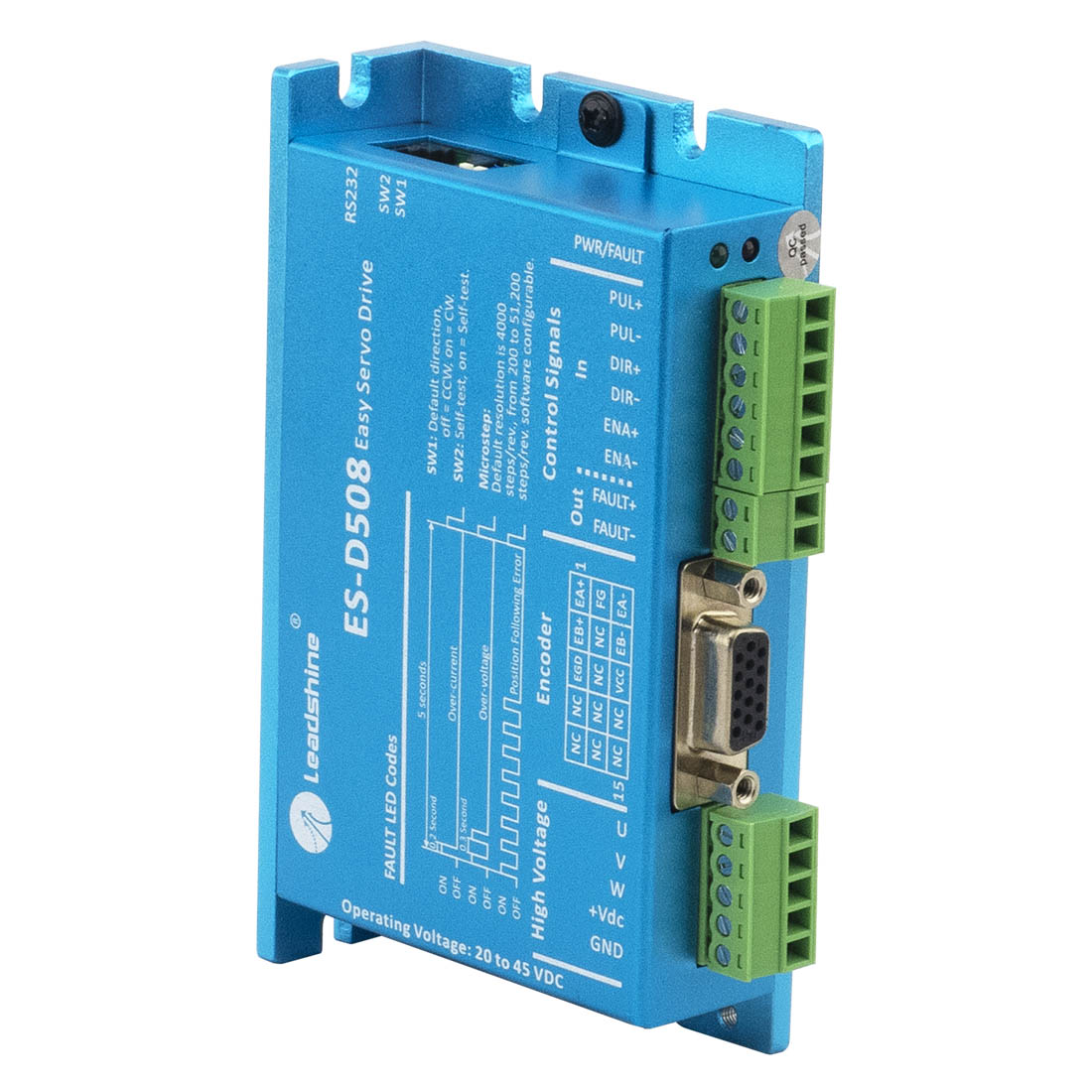 ES-D508 относится к серии серво-шаговых приводов Leadshine с рабочим напряжением до 50В и выходным током до 8,0А. Используется совместно с двигателями серии ES-M. Отличается низкой стоимостью (по сравнению с обычным сервоприводом), высоким крутящим моментом, высоким пусковым и низкоскоростным крутящим моментом, высокой жесткостью в состоянии покоя, высокой точностью без потери шагов, сверхнизким нагревом двигателя, отсутствуем перерегулирования и рыскания при остановке, практически нулевым временем установки, широким диапазоном применения. Простота настройки ускоряет ввод в эксплуатацию, не требуя высокой квалификации персонала. Рекомендуем использовать этот драйвер с двигателями типа ES-M32309 / ES-M32320.