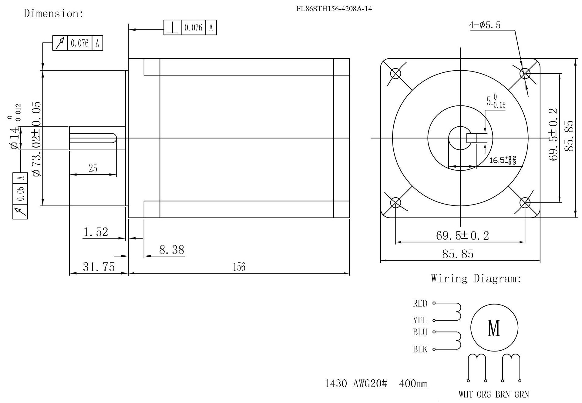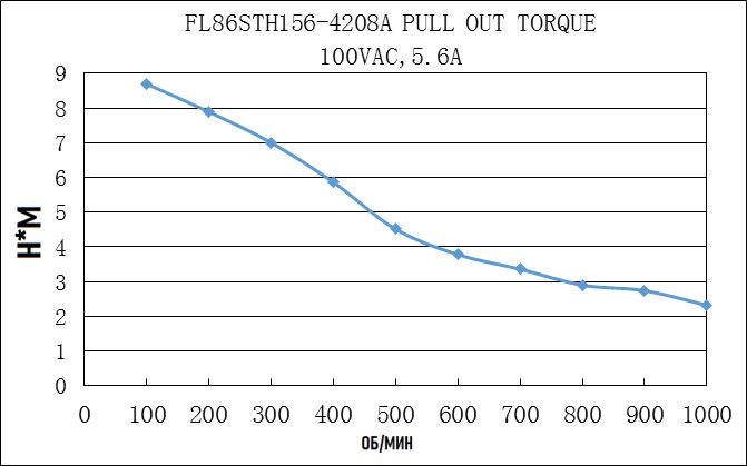 Гибридный шаговый двигатель Fulling Motor FL86STH156-4208A-14 имеет 8 выводов для подключения и следующие электромеханические характеристики при различных типах включения: