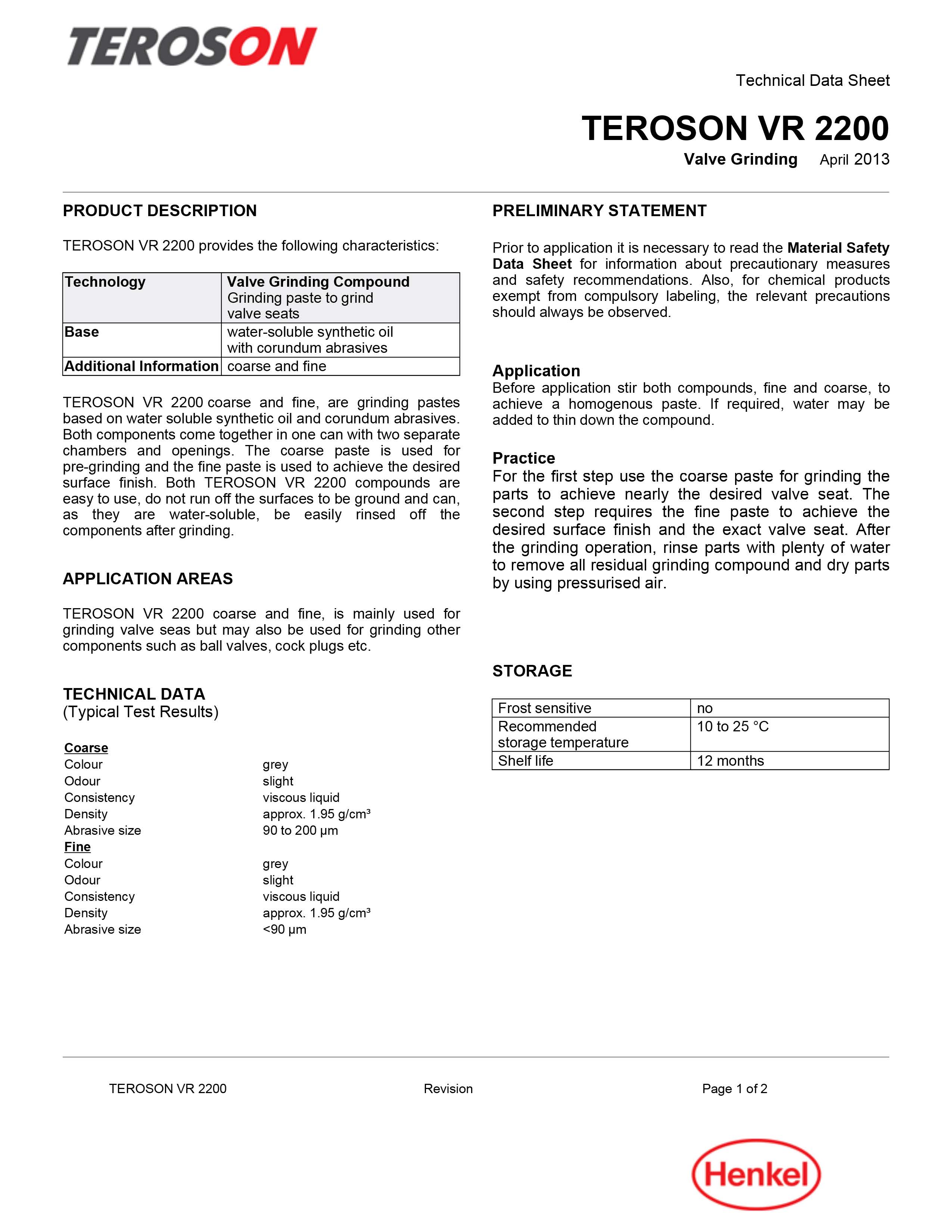 Состав Teroson VR 2200 поставляется в одной банке, с двумя отдельными секциями и отдельными крышками. Паста Теросон для грубой шлифовки применяется для предварительной обработки, а паста для чистого шлифования применяется для получения необходимого качества поверхности. Данная паста в основном применяются для притирки клапанов.