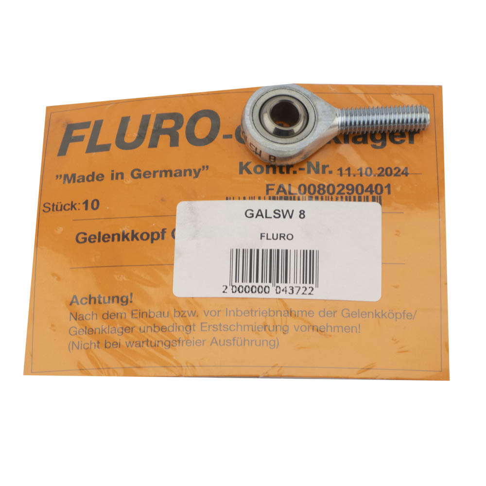 FLURO GALSW 8 — это шарнирный наконечник с наружной резьбой, предназначенный для установки в подвижных соединениях с ограниченным монтажным пространством. Обеспечивает передачу радиальных нагрузок и компенсацию угловых отклонений в тяговых, рулевых и приводных механизмах.
