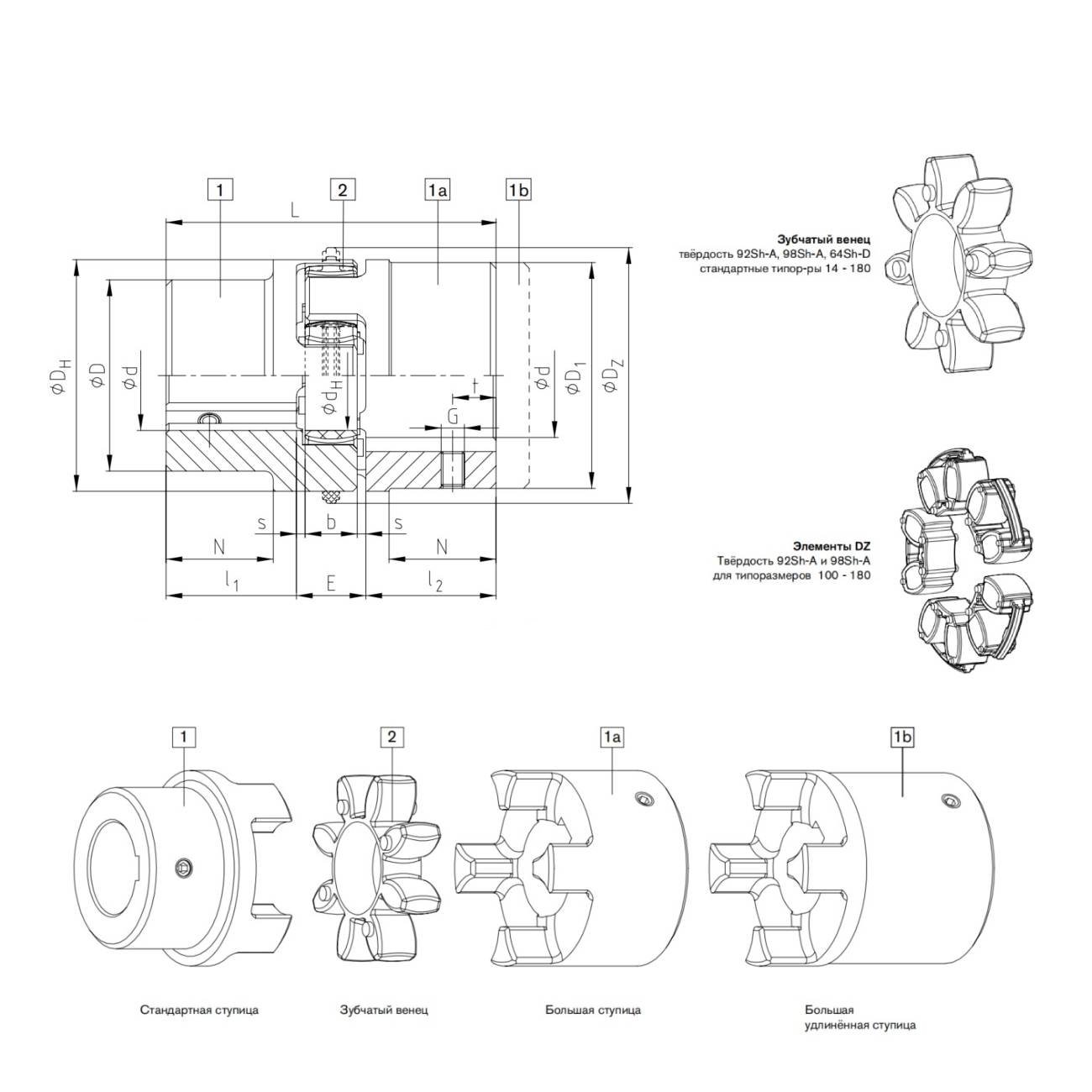 | 92 Sh-A | 98 Sh-A | 64 Sh-D | L | l1;l2 | E | b | s | DH | DZ | dH | D; D1 | N | G | t | TA, Н·м | |||