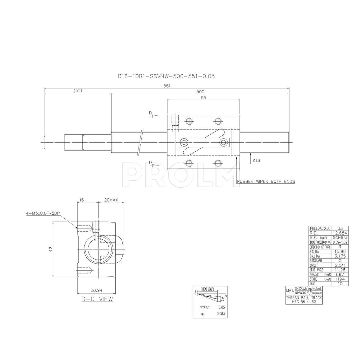 Шариковинтовой привод R16-10B1-SSVNW-500-551-0.05 производства компании HIWIN включает в себя одну гайку R16-10B1-SSVNW и винт R16-10-0.05 (R16-10-500-551-0.05).