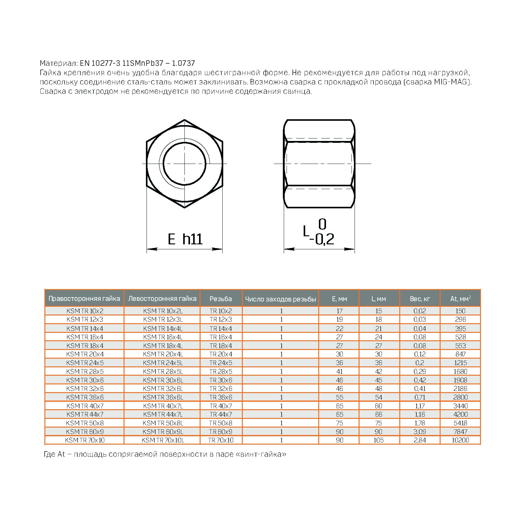 Гайка шестигранная для трапецеидального винта ARTNC KSM TR 20x4 соответствующего типоразмера изготавливается из стали 11SMn30. Гайка предназначена для регулировки или фиксации оборудования. Соединение сталь-сталь используемое при работе под нагрузкой может заклинивать. Материал свариваемый. Указанная система может эксплуатироваться даже при наличии значительных загрязнений.
