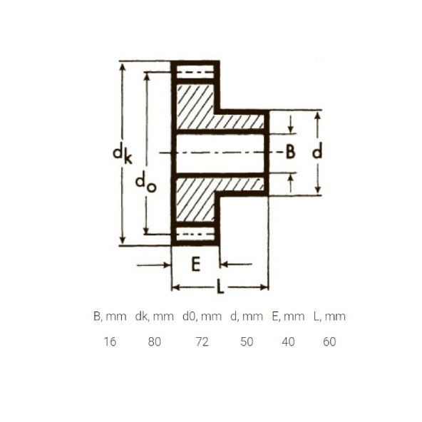 | B, мм | dk, мм | d0, мм | d, мм | E, мм | L, мм |