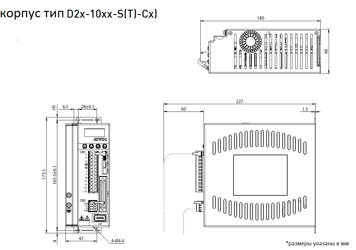Серводрайвер серии D2 предназначен для работы с серводвигателем мощностью до 1 кВт и может работать с внешним контроллером в режимах задания позиции, скорости, момента или автономно в соответствии с программой, написанной пользователем. Режим управления преобразователем - векторная ШИМ. Запитывается драйвер от 1 или 3 фаз 220В. Для настройки привода на передней панели имеется ЖК дисплей с 4-мя кнопками управления и USB разьем для настройки с ПК. Для управления используется стандартный инитерфейс (импульсный). Драйвер работает с оптоизолированными (до 5*10^5 имп./с.) или дифференциальными импульсными входами(до 4*10^6 имп./с.), квадратурным входом (до 1,6*10^7 имп./с.) и имеет выход эмулятора энкодера с настраиваемой электронной редукцией. У драйвера имеется 9 входов, 4 выхода общего назначения и один вход АЦП 12бит, выход для подключения электромеханического тормоза. Для обратной связи с двигателем используется 17 битный энкодер. Драйвер поддерживает: