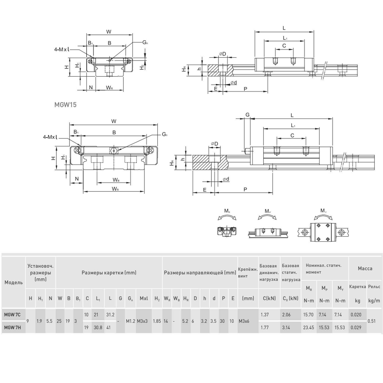 Каретка (также могут использоваться названия "блок системы линейного перемещения", "опорный блок", "направляющий блок", "танкетка", "линейный подшипник", "опорный подшипник" и прочие) HIWIN MGW7CZ0HM имеет следующие параметры: