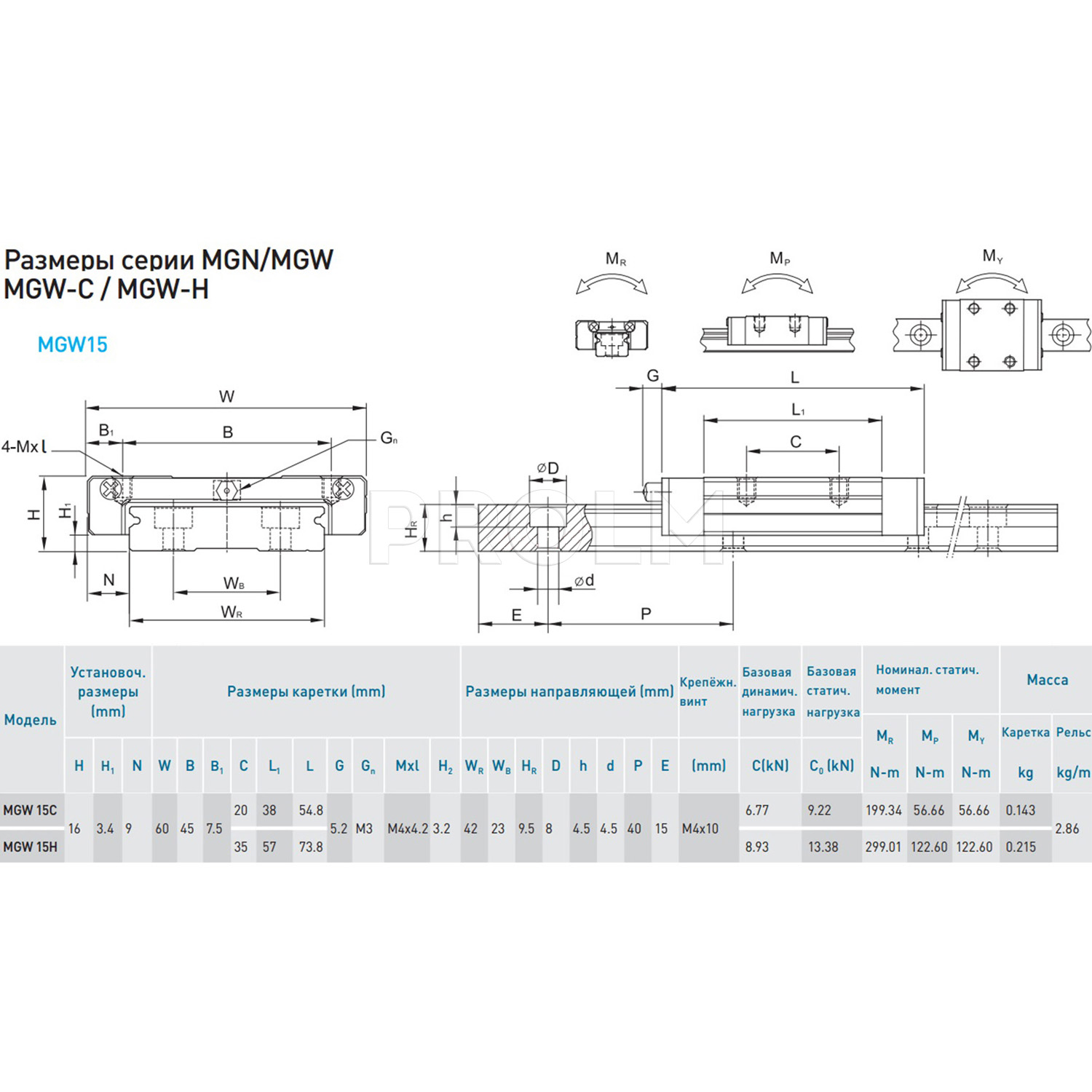 Каретка (также могут использоваться названия "блок системы линейного перемещения", "опорный блок", "направляющий блок", "танкетка", "линейный подшипник", "опорный подшипник" и прочие) HIWIN MGW15HZ0HM имеет следующие параметры: