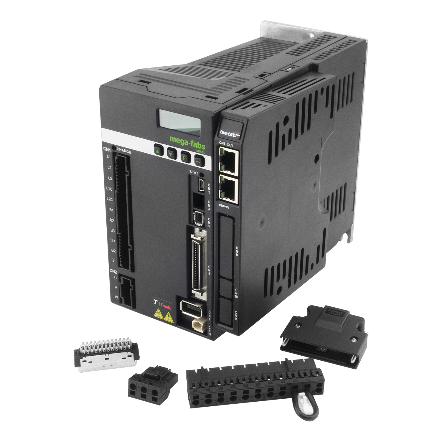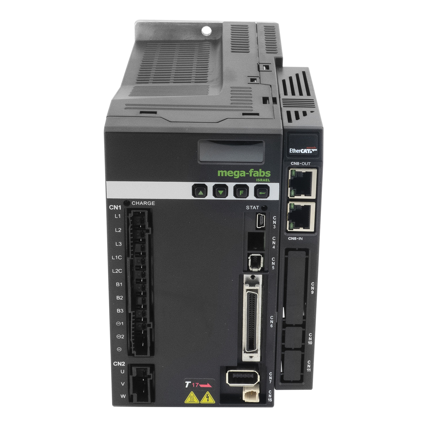 Серводрайвер серии D2 предназначен для работы с серводвигателем мощностью до 2 кВт и может работать с внешним контроллером в режимах задания позиции, скорости, момента или автономно в соответствии с программой, написанной пользователем. Режим управления преобразователем - векторная ШИМ. Запитывается драйвер от 3 фаз 220В. Для настройки привода на передней панели имеется ЖК дисплей с 4-мя кнопками управления и USB разьем для настройки с ПК. Для управления используется интерфейс etherCAT(CoE). Драйвер работает с оптоизолированными (до 5*10^5 имп./с.) или дифференциальными импульсными входами(до 4*10^6 имп./с.), квадратурным входом (до 1,6*10^7 имп./с.) и имеет выход эмулятора энкодера с настраиваемой электронной редукцией. У драйвера имеется 9 входов, 4 выхода общего назначения и один вход АЦП 12бит, выход для подключения электромеханического тормоза. Для обратной связи с двигателем используется 17 битный абсолютный энкодер . Драйвер поддерживает: