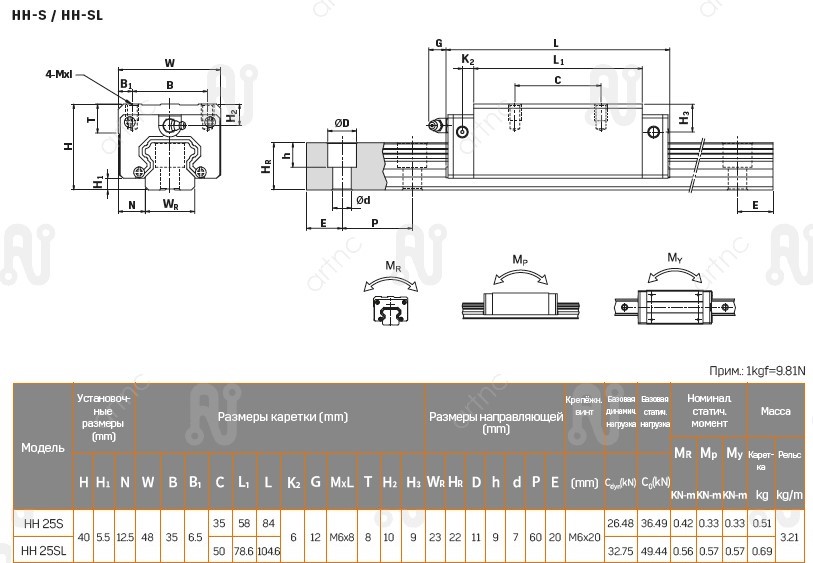 Каретка (также могут использоваться названия "блок системы линейного перемещения", "опорный блок", "направляющий блок", "танкетка", "линейный подшипник", "опорный подшипник" и прочие) ArtNC HH25SZ1H имеет следующие параметры: