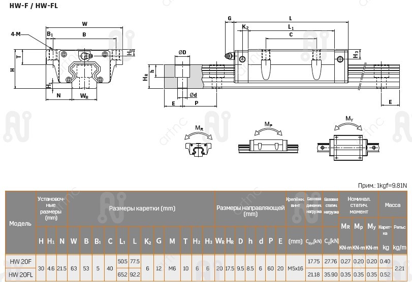 Каретка (также могут использоваться названия "блок системы линейного перемещения", "опорный блок", "направляющий блок", "танкетка", "линейный подшипник", "опорный подшипник" и прочие) ArtNC HW20FLZ1H имеет следующие параметры: