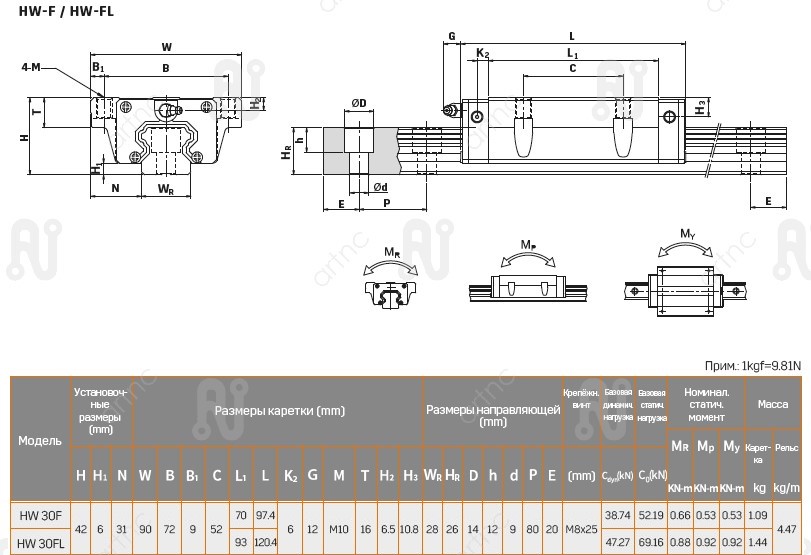 Каретка (также могут использоваться названия "блок системы линейного перемещения", "опорный блок", "направляющий блок", "танкетка", "линейный подшипник", "опорный подшипник" и прочие) ArtNC HW15FZ1H имеет следующие параметры: