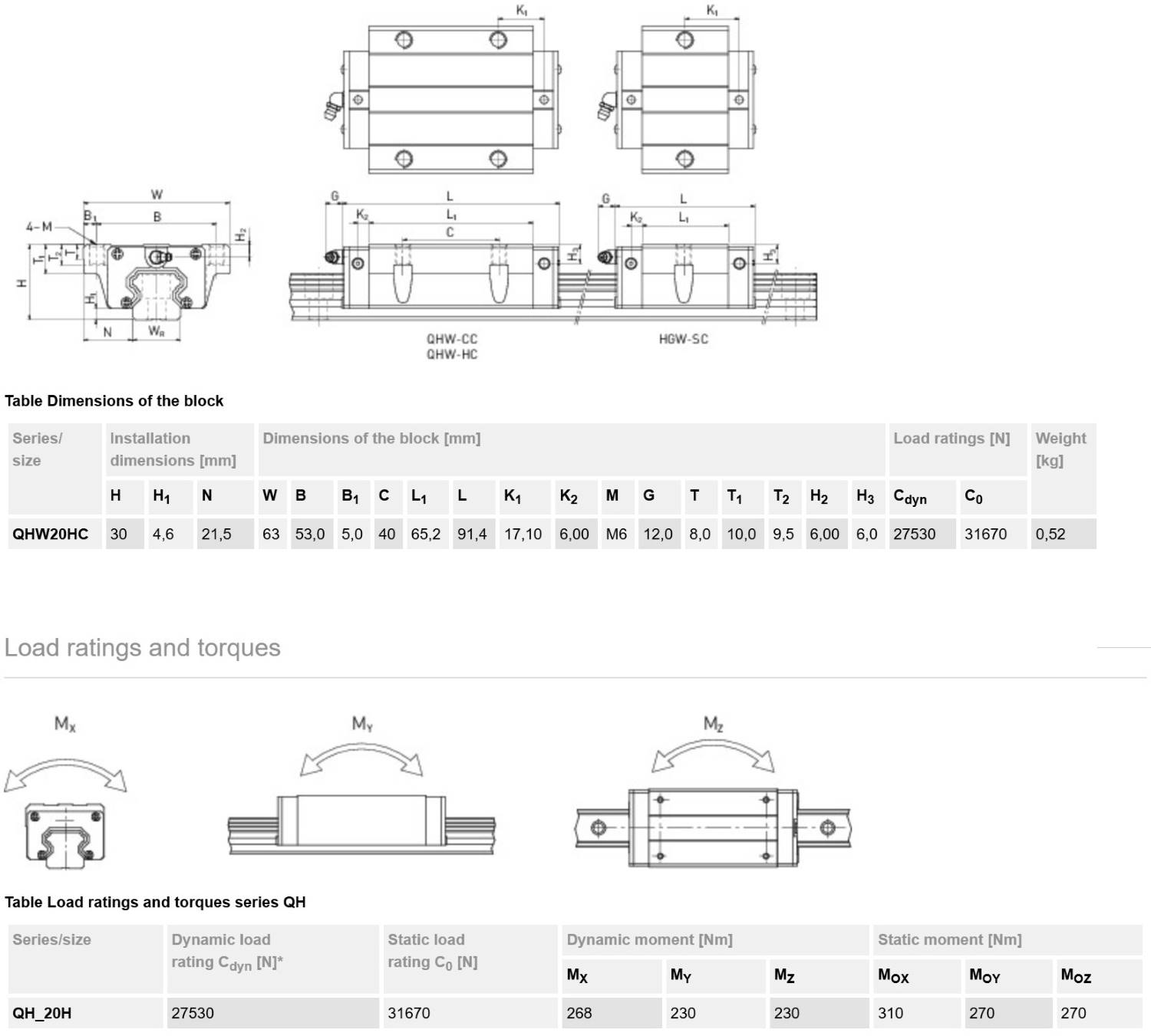 Каретка (также могут использоваться названия "блок системы линейного перемещения", "опорный блок", "направляющий блок", "танкетка", "линейный подшипник", "опорный подшипник" и прочие) HIWIN QHW20HCZAH имеет следующие параметры: