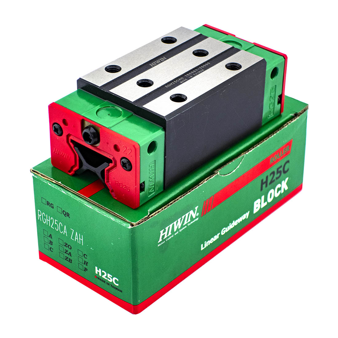 Каретка (также могут использоваться названия "блок системы линейного перемещения", "опорный блок", "направляющий блок", "танкетка", "линейный подшипник", "опорный подшипник" и прочие) HIWIN RGH25CAZ0H имеет следующие параметры: