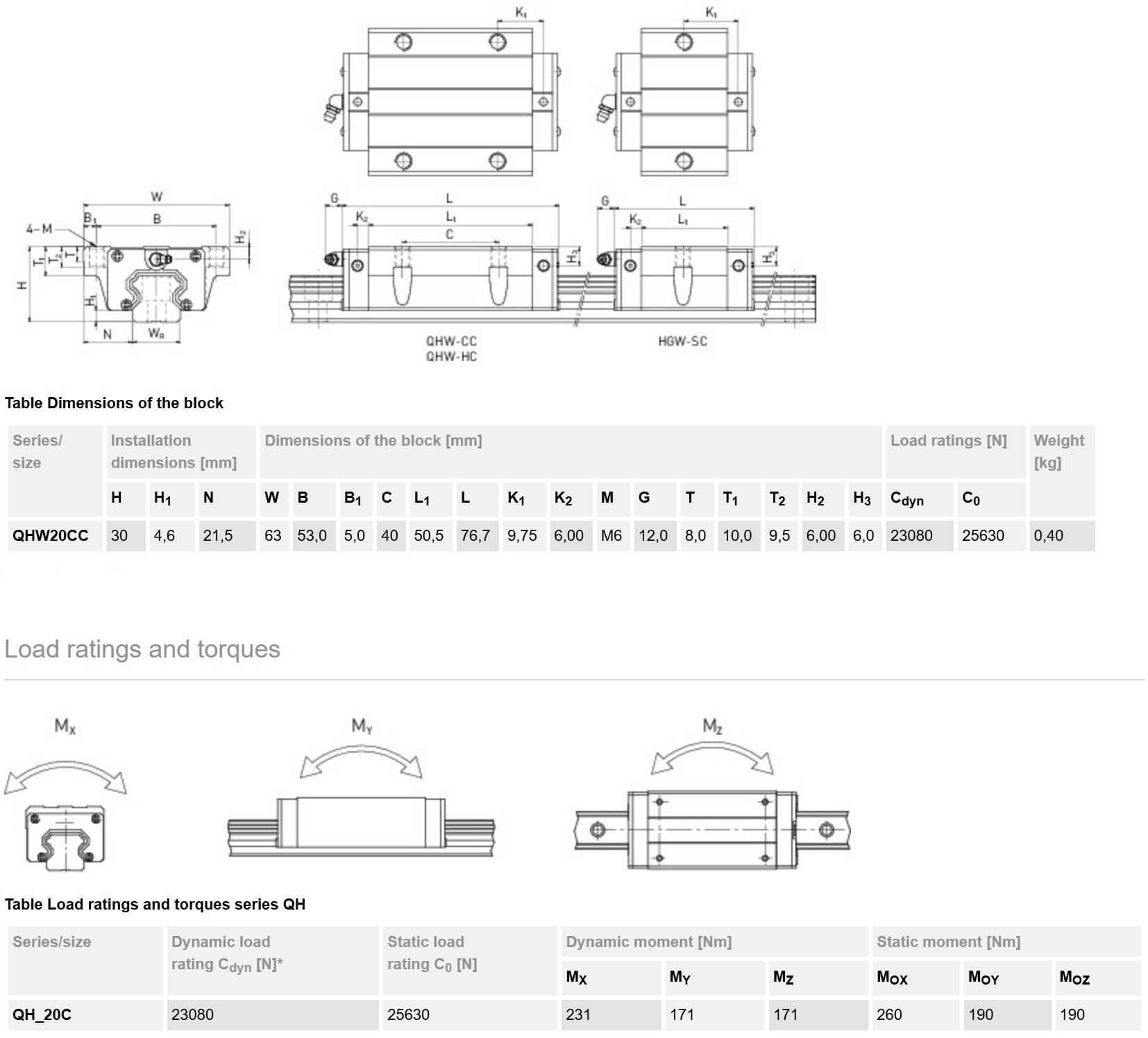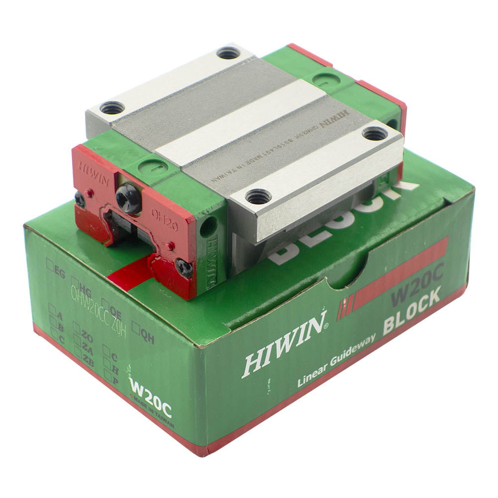 Каретка (также могут использоваться названия "блок системы линейного перемещения", "опорный блок", "направляющий блок", "танкетка", "линейный подшипник", "опорный подшипник" и прочие) HIWIN QHW20CCZ0H имеет следующие параметры: