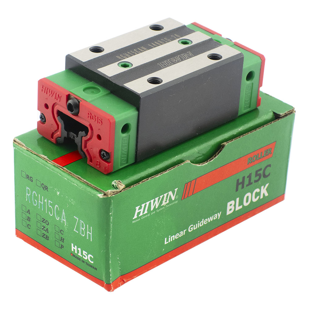 Каретка (также могут использоваться названия "блок системы линейного перемещения", "опорный блок", "направляющий блок", "танкетка", "линейный подшипник", "опорный подшипник" и прочие) HIWIN RGH15CAZBH имеет следующие параметры: