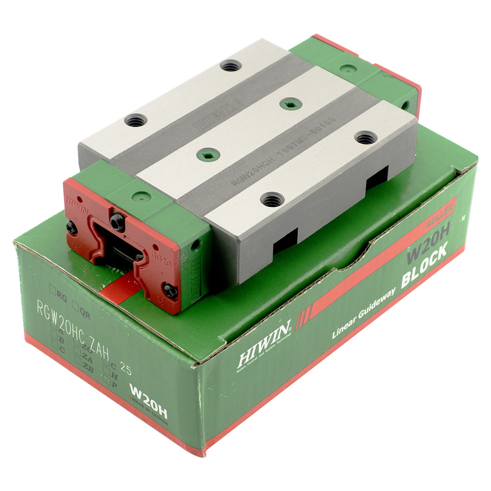 Каретка (также могут использоваться названия "блок системы линейного перемещения", "опорный блок", "направляющий блок", "танкетка", "линейный подшипник", "опорный подшипник" и прочие) HIWIN RGW20HCZAH имеет следующие параметры: