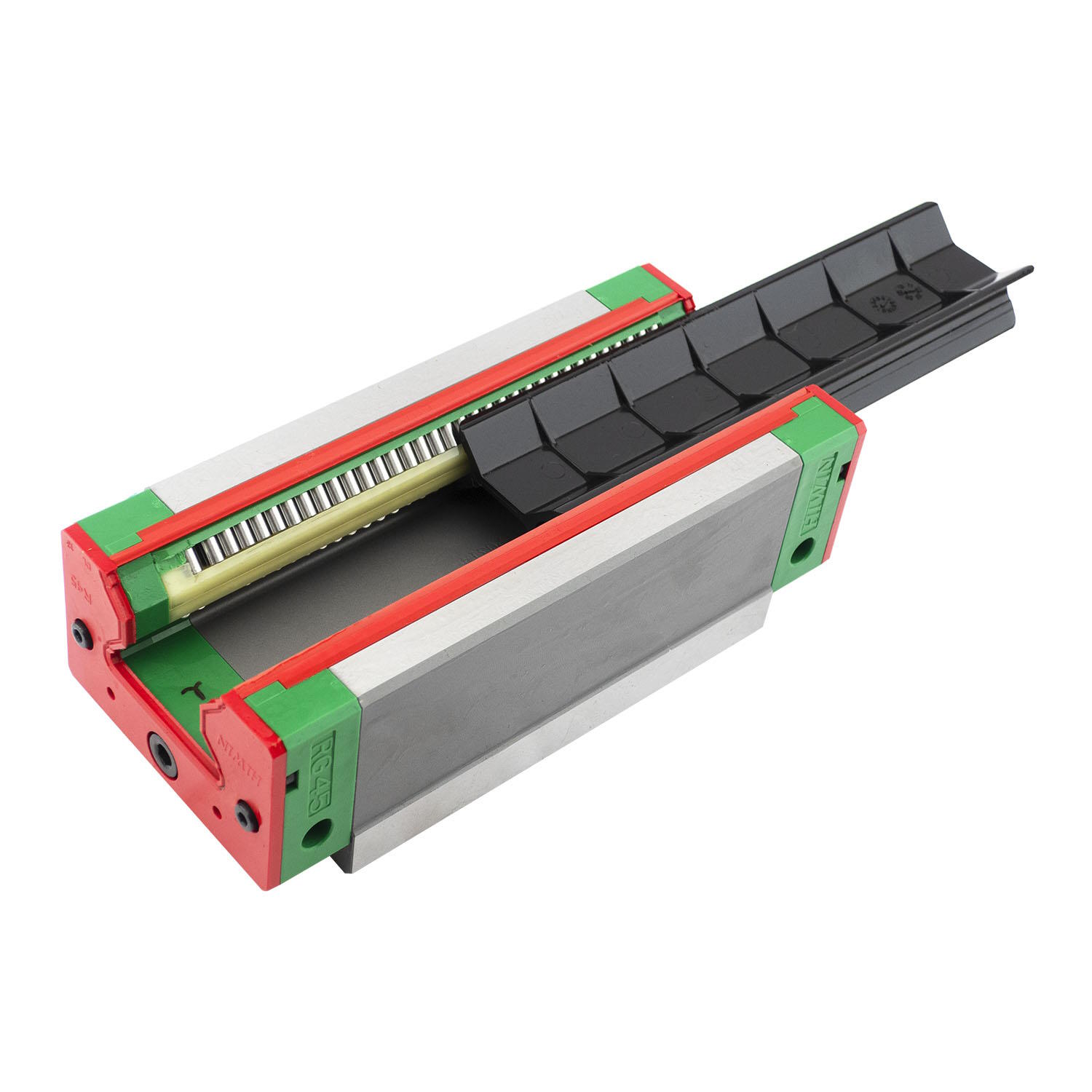 В отличии от шариковых систем в серии направляющих RG в качестве тел качения используются ролики. С помощью FEM-анализа был разработан уникальный дизайн с оптимальной структурой каретки и рельса, позволяющий обеспечить плавность перемещения. Благодаря системе с четырьмя рядами роликов, расположенных под углом 45 градусов, направляющие серии RG способны воспринимать высокие нагрузки в радиальном и поперечном направлениях, а также обеспечивать общую высокую жесткость системы. Контактное давление ролика распределяется по линии, поэтому концентрация напряжений в пятне контакта значительно снижена в отличии от шарика. В свою очередь это обеспечивает более длительный срок службы линейных направляющих серии RG, номинальный срок службы может быть рассчитан с использованием формул из каталога. В целом роликовые направляющие имеют более высокую грузоподъемность в меньших размерах в сравнении с шариковыми системами. Данный тип линейных направляющих является взаимозаменяемым, то есть каретки RG совместимы с рельсами этой же серии аналогичного типоразмера.