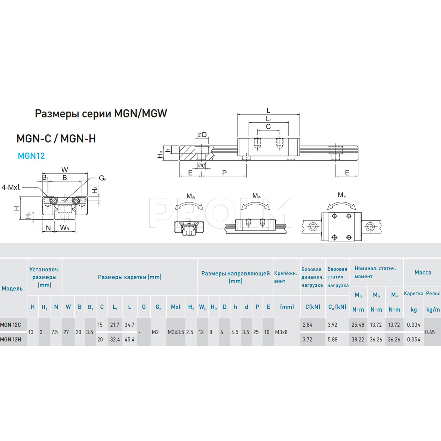 Каретка (также могут использоваться названия "блок системы линейного перемещения", "опорный блок", "направляющий блок", "танкетка", "линейный подшипник", "опорный подшипник" и прочие) HIWIN MGN12HZ0HM имеет следующие параметры: