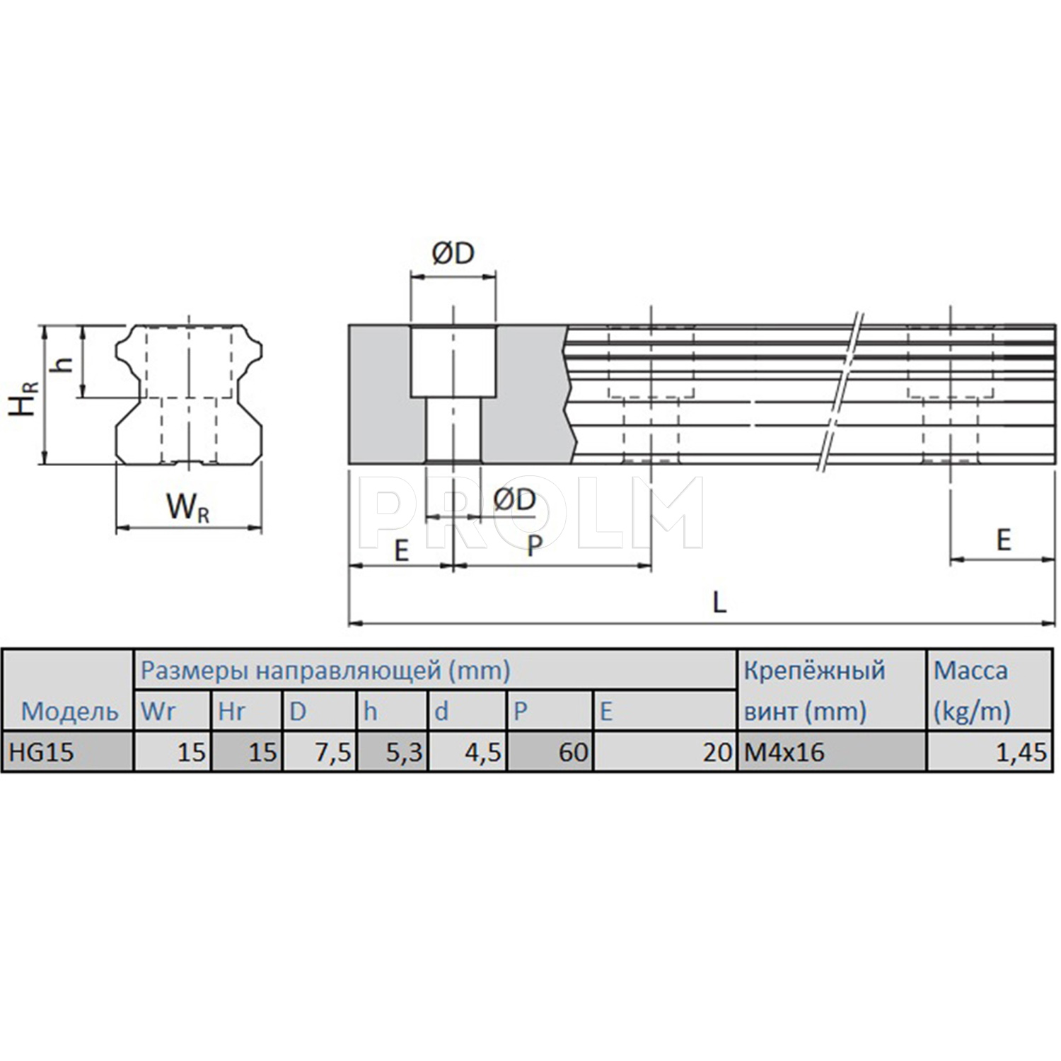 Профильная направляющая (рельс) HIWIN HGR15R_H для систем линейных перемещений имеет следующие характеристики: