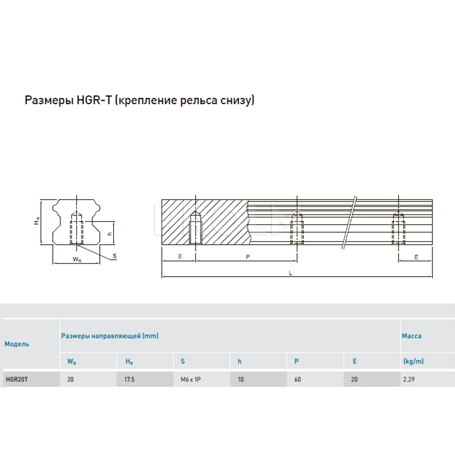 Профильная направляющая (рельс) HIWIN HGR20T_H для систем линейных перемещений имеет следующие характеристики:
