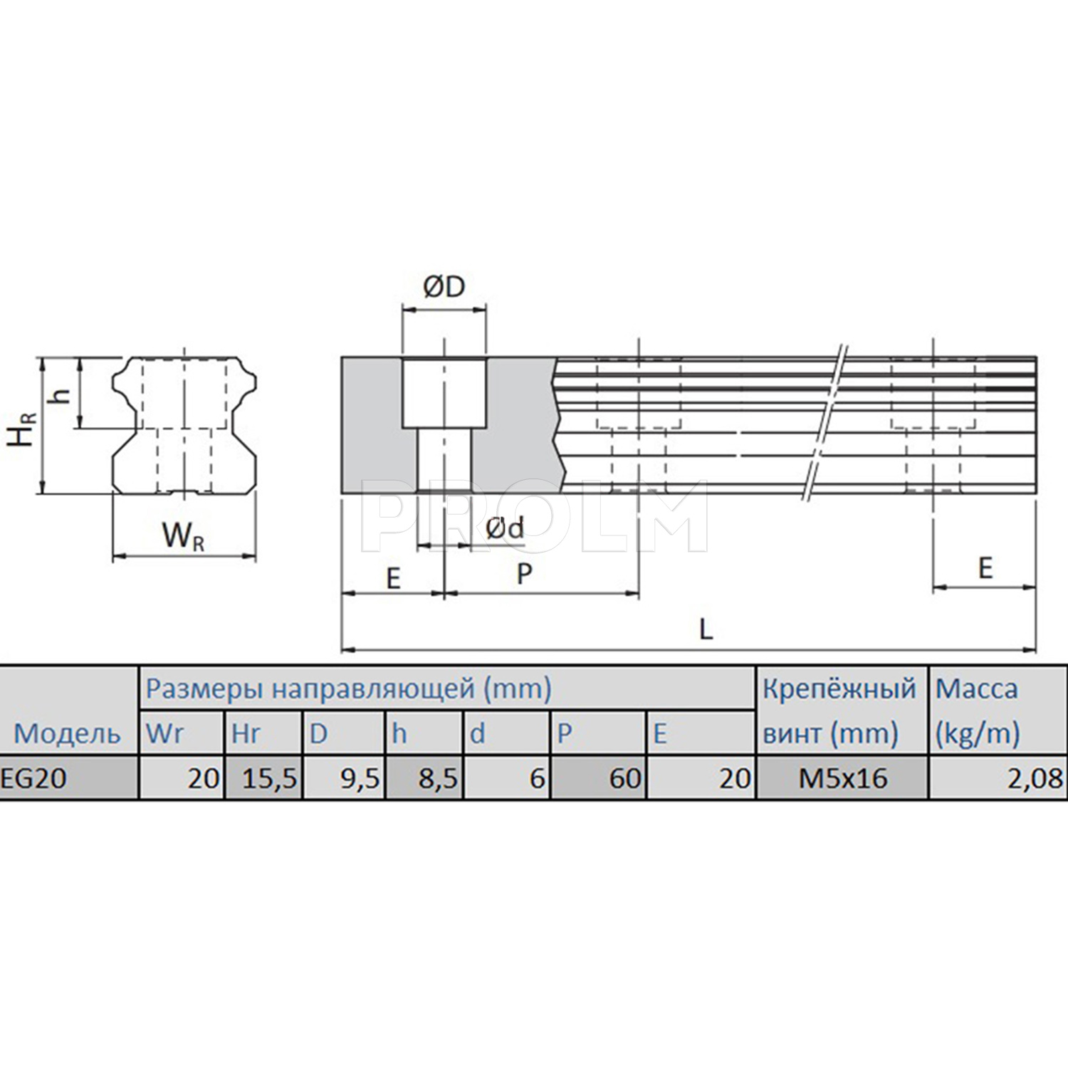 Профильная направляющая (рельс) HIWIN EGR20R_H для систем линейных перемещений имеет следующие характеристики: