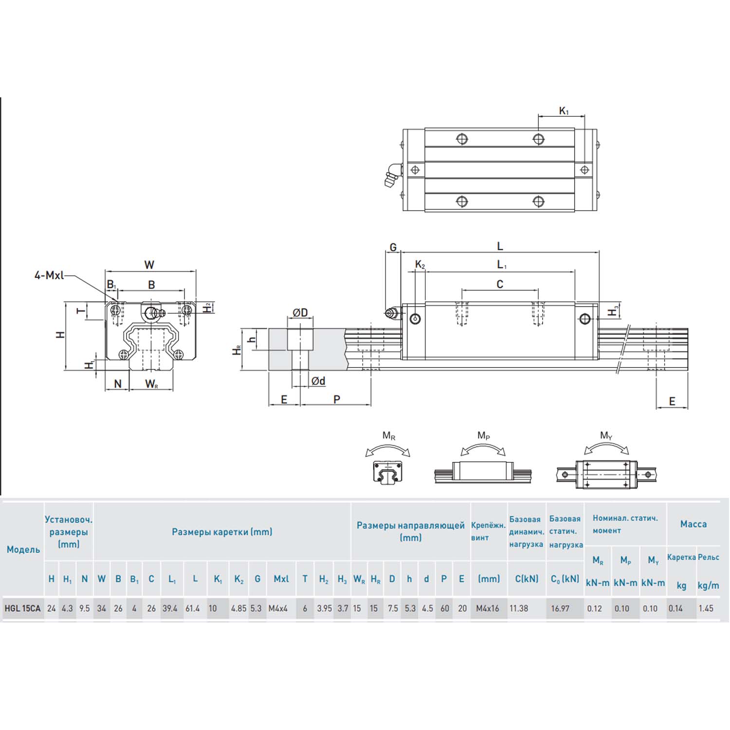 Каретка (также могут использоваться названия "блок системы линейного перемещения", "опорный блок", "направляющий блок", "танкетка", "линейный подшипник", "опорный подшипник" и прочие) HIWIN HGL15CAZAH имеет следующие параметры: