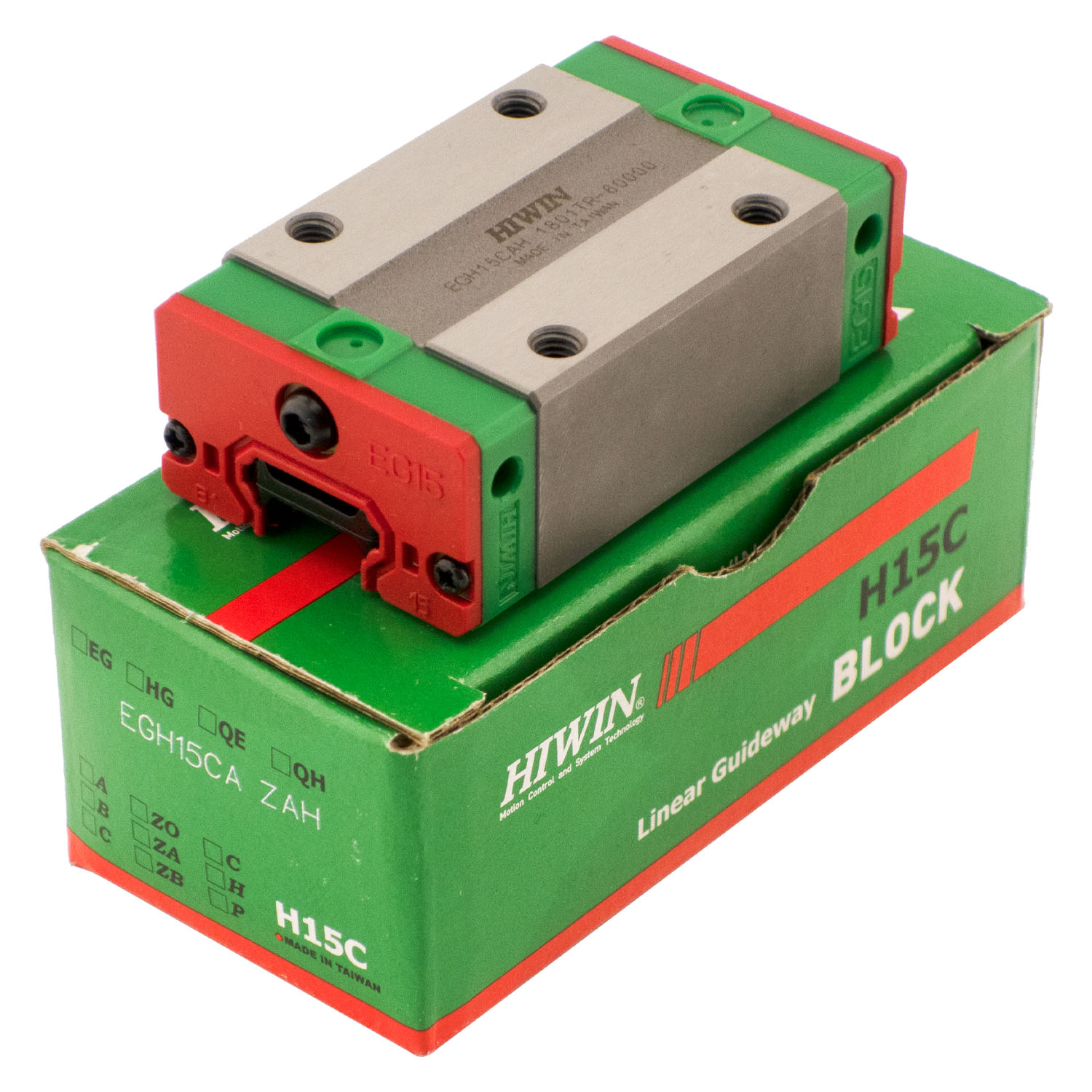 Каретка (также могут использоваться названия "блок системы линейного перемещения", "опорный блок", "направляющий блок", "танкетка", "линейный подшипник", "опорный подшипник" и прочие) HIWIN EGH15CAZAH имеет следующие параметры:
