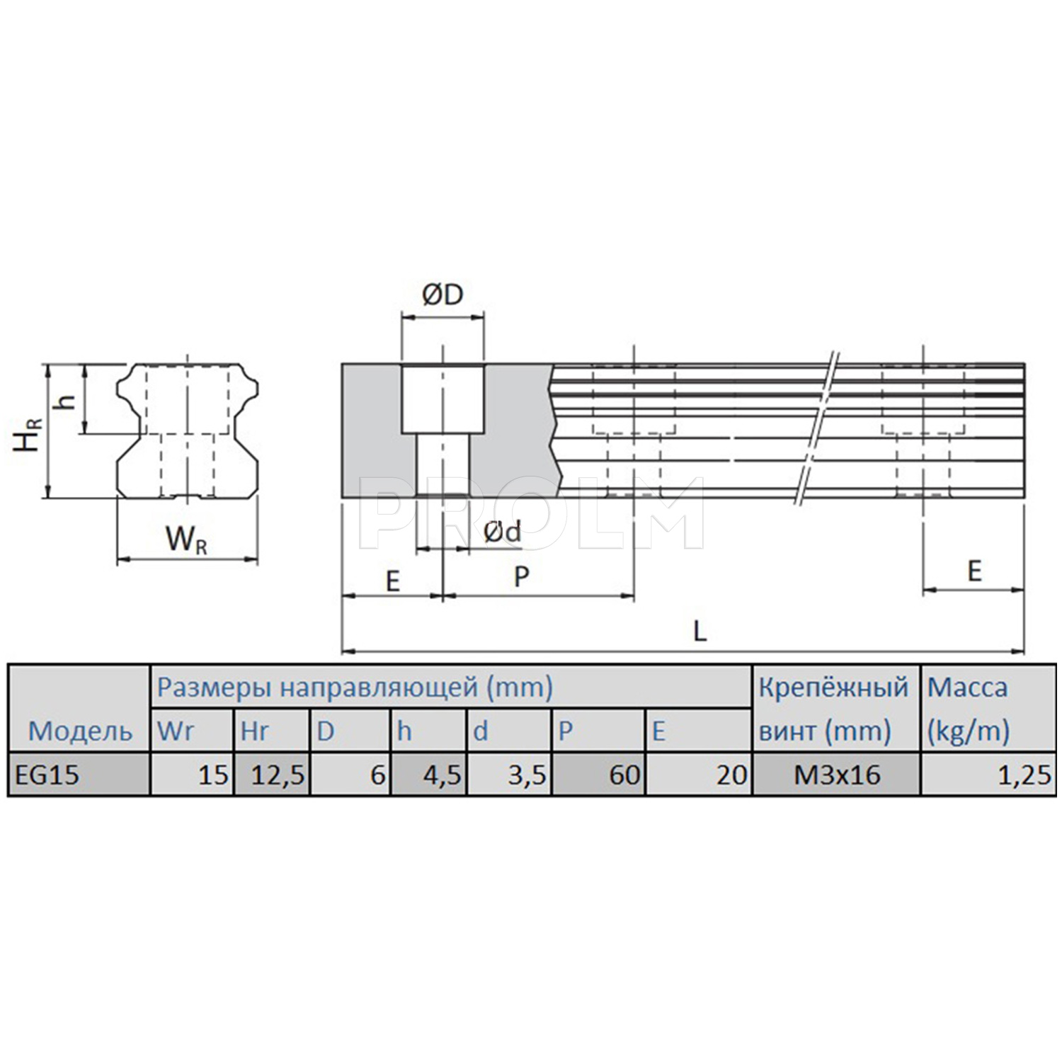 Профильная направляющая (рельс) HIWIN EGR15R_H для систем линейных перемещений имеет следующие характеристики: