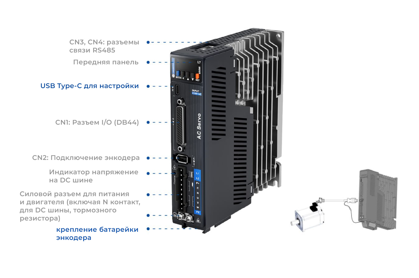 Сервоприводы переменного тока серии EL7 выпускаются в обновленном дизайне, в новой серии производитель добавил контакт для объединения шин постоянного тока нескольких сервоприводов, а так же крепление батарейки энкодера. Разъем для настройки обновлен до стандарта USB Type-C.