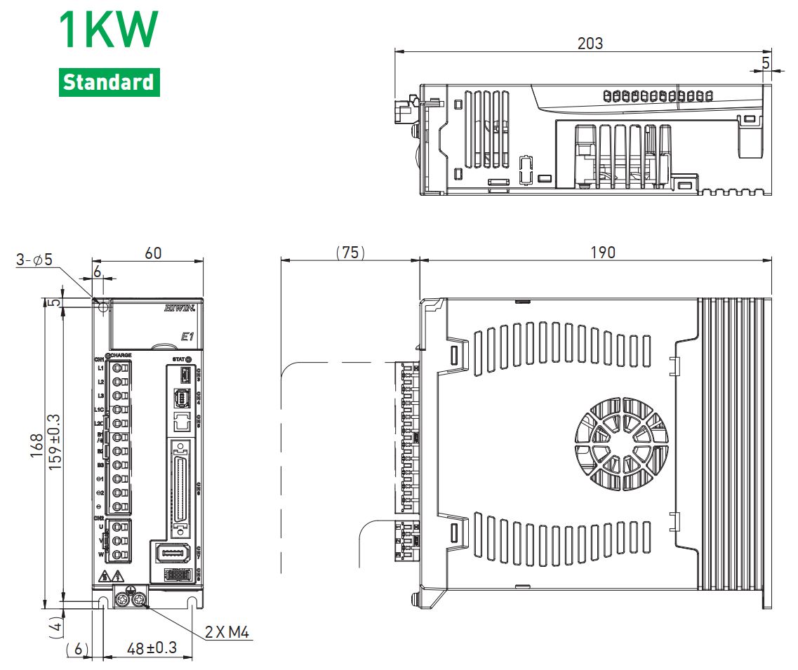 Серводрайвер серии E1 предназначен для работы с серводвигателем мощностью до 1 кВт и энкодером с разрешением 23 бит. Может работать с внешним контроллером в режимах задания позиции, скорости, момента или автономно в соответствии с программой, написанной пользователем. Режим управления преобразователем - векторная ШИМ. Запитывается драйвер от 1 или 3 фаз 220В. Для настройки привода на передней панели имеется 7 сегментный дисплей с элементами управления и USB разьем для настройки с ПК. Для управления используется стандартный инитерфейс (импульсный) с оптоизолированными (до 200 КГц) или дифференциальными импульсными входами(до 5 МГц.). Драйвер имеет выход эмулятора энкодера с настраиваемой электронной редукцией. Поддерживаются квадратупные энкодеры, а с помощью ESC можно подключать также аналоговые (SIN/COS) и цифровые (BiSS-C, EnDat 2.1/2.2, Tamagawa) энкодеры, PTC термодатчики и датчики Холла. У драйвера имеется 10 входов, 5 выходов общего назначения и один вход АЦП 16бит. Драйвер поддерживает:
