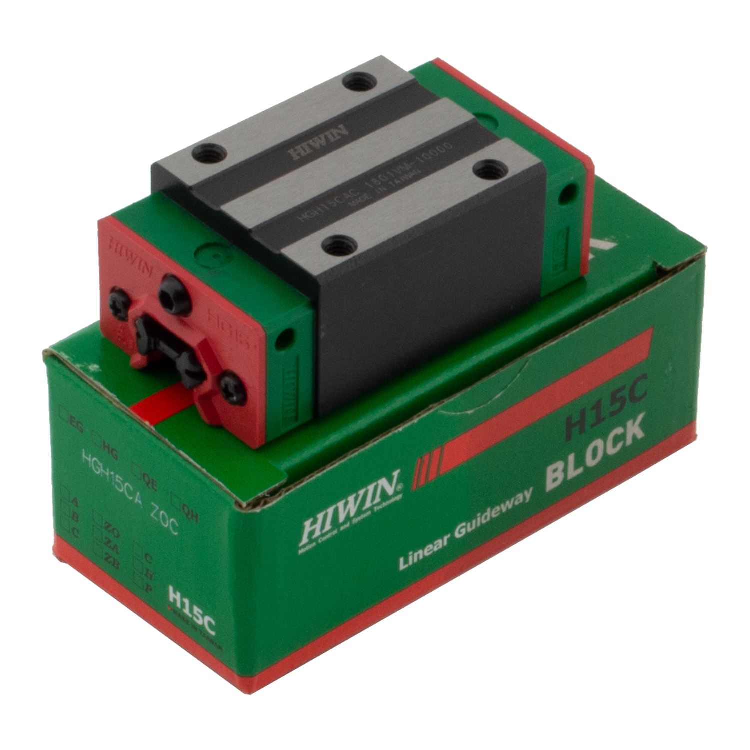 Каретка (также могут использоваться названия "блок системы линейного перемещения", "опорный блок", "направляющий блок", "танкетка", "линейный подшипник", "опорный подшипник" и прочие) HIWIN HGH15CAZ0C имеет следующие параметры: