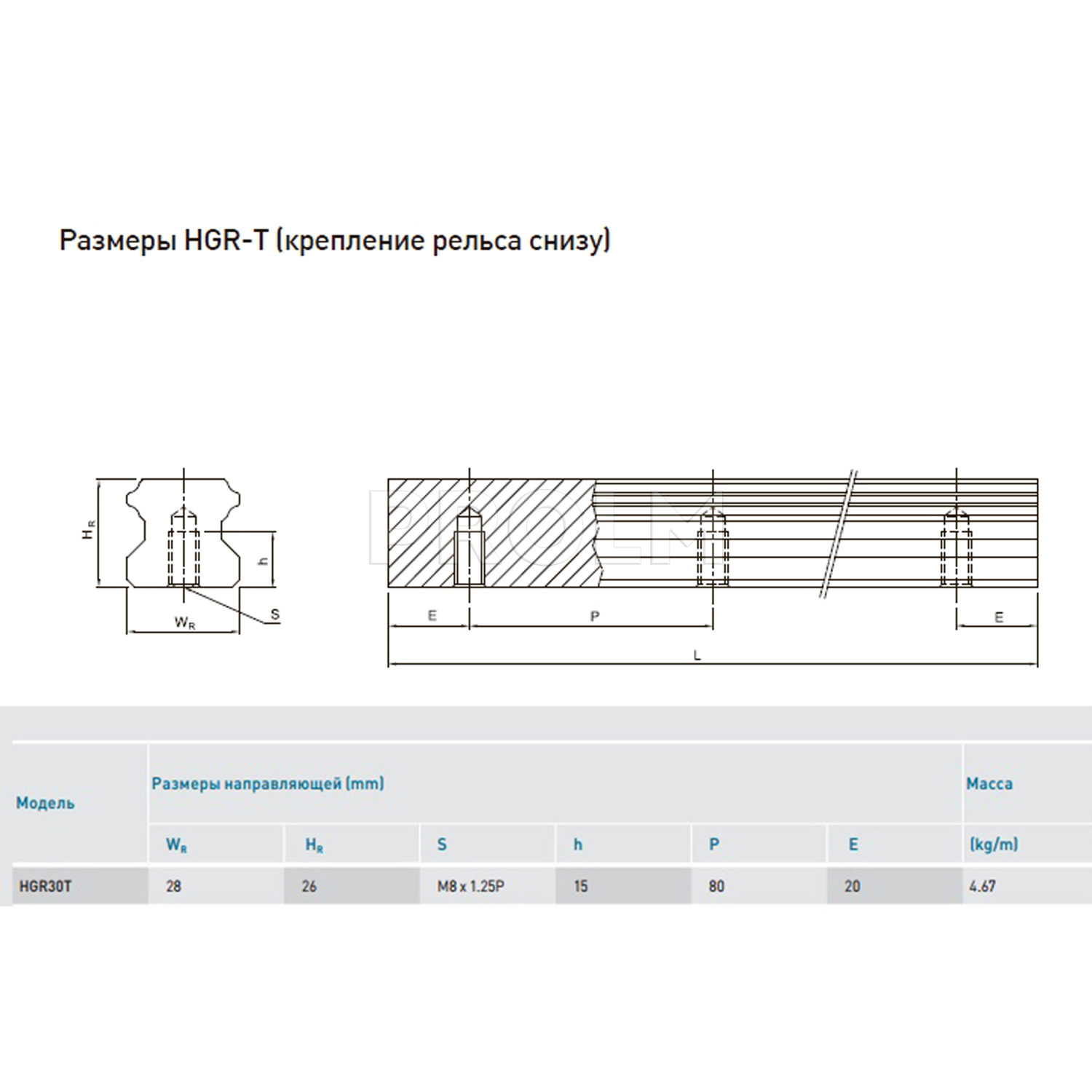 Профильная направляющая (рельс) HIWIN HGR30T_H для систем линейных перемещений имеет следующие характеристики: