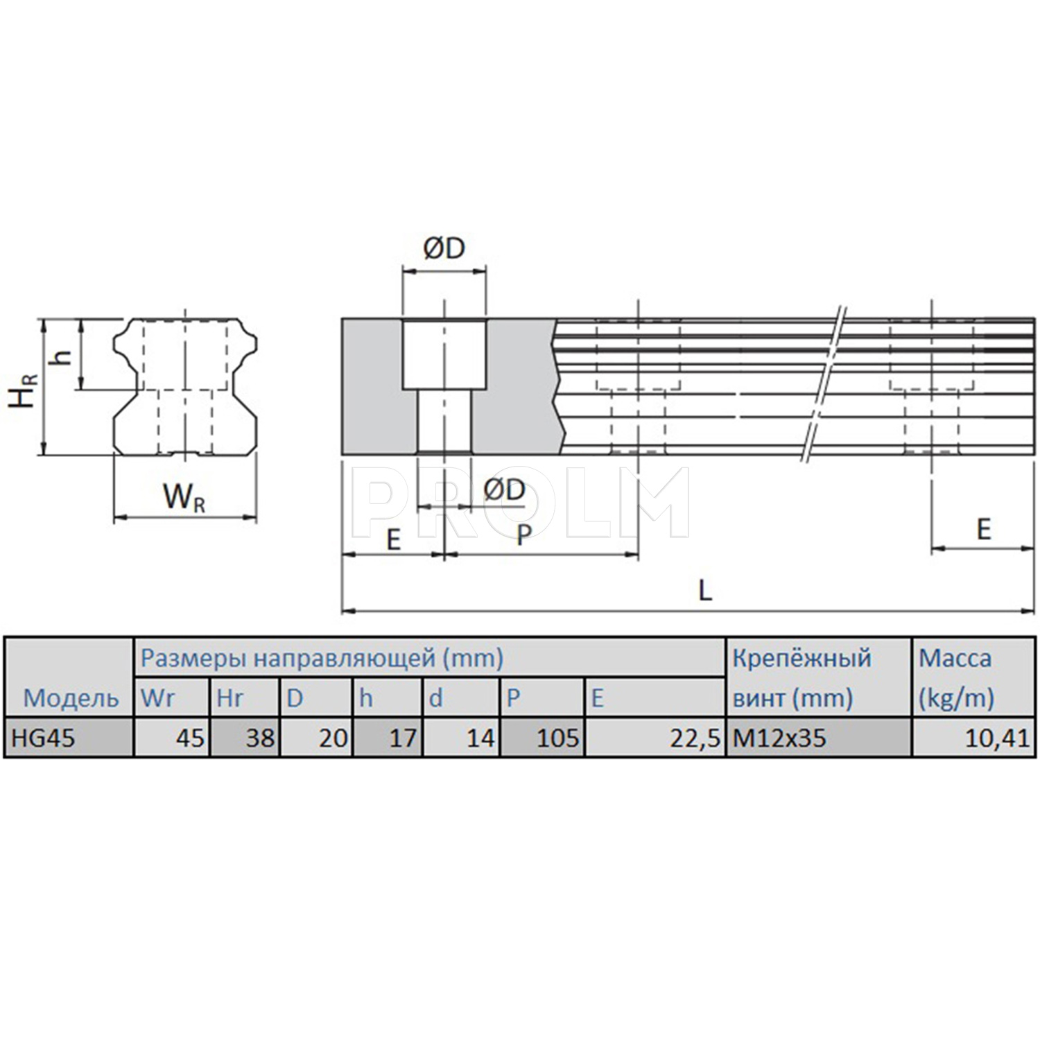 Профильная направляющая (рельс) HIWIN HGR45R_P для систем линейных перемещений имеет следующие характеристики: